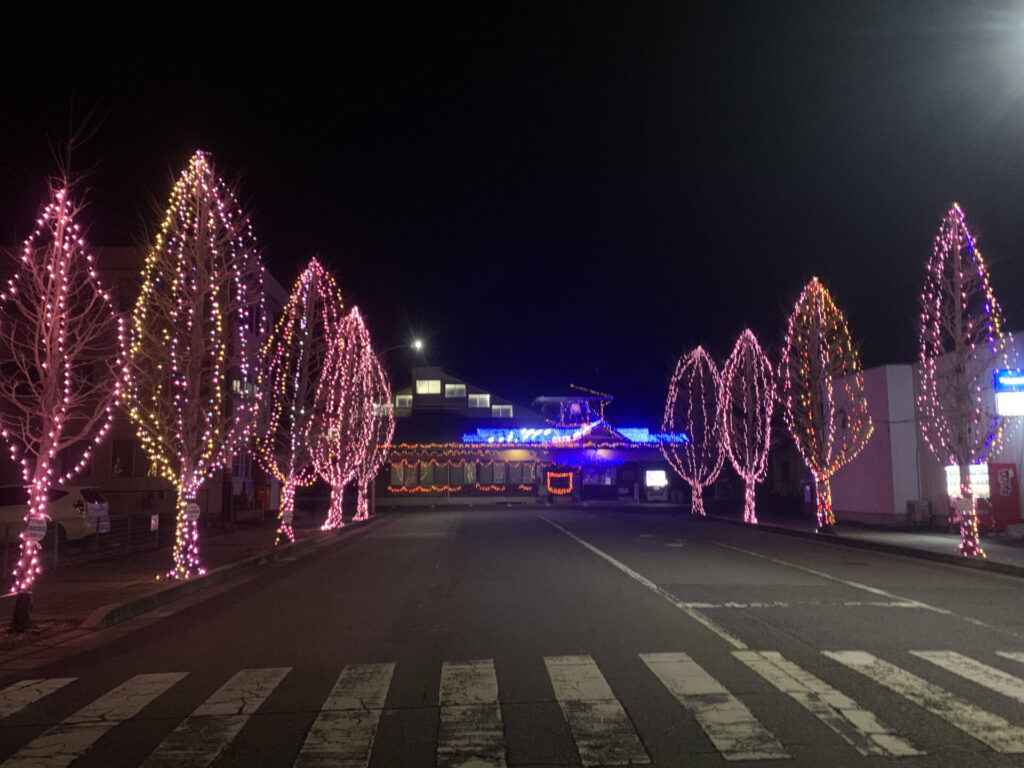 「ピンクや青、オレンジの光が、静かな夜道をやさしく照らす「冬の蛍通り」。帰り道が少し特別な時間になりますね。」