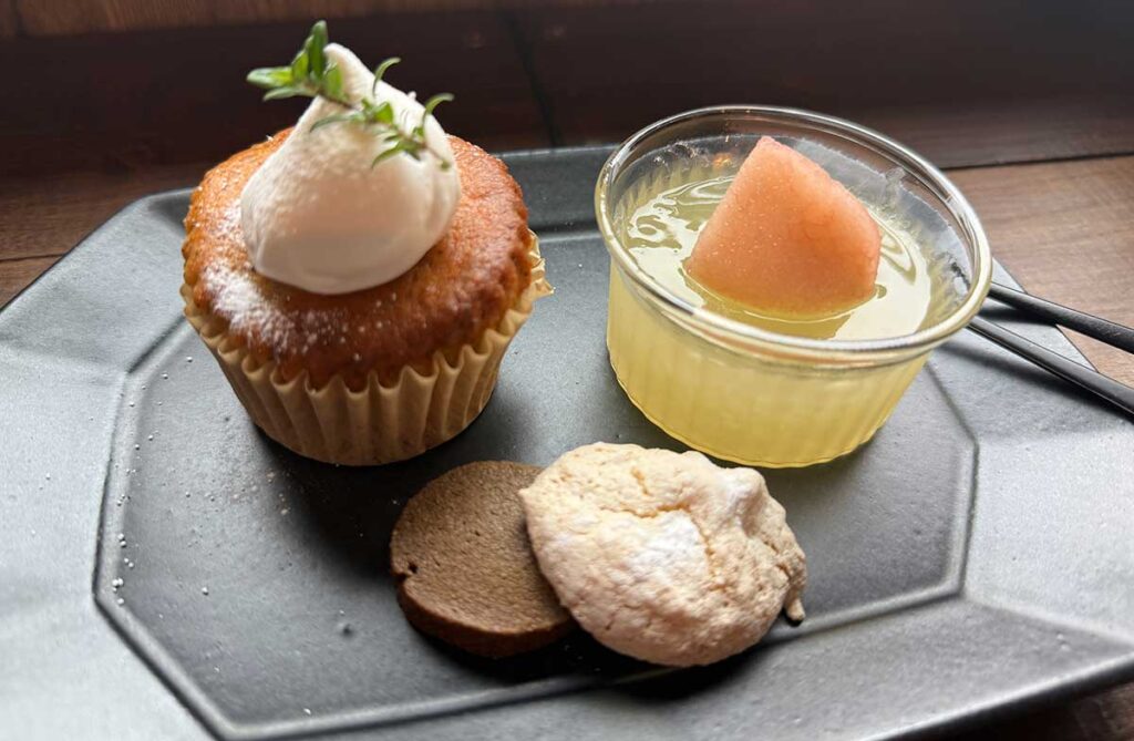 この日のスイーツは「梅ソースのマフィン」「フルーツゼリー」「クッキー2種」でした。